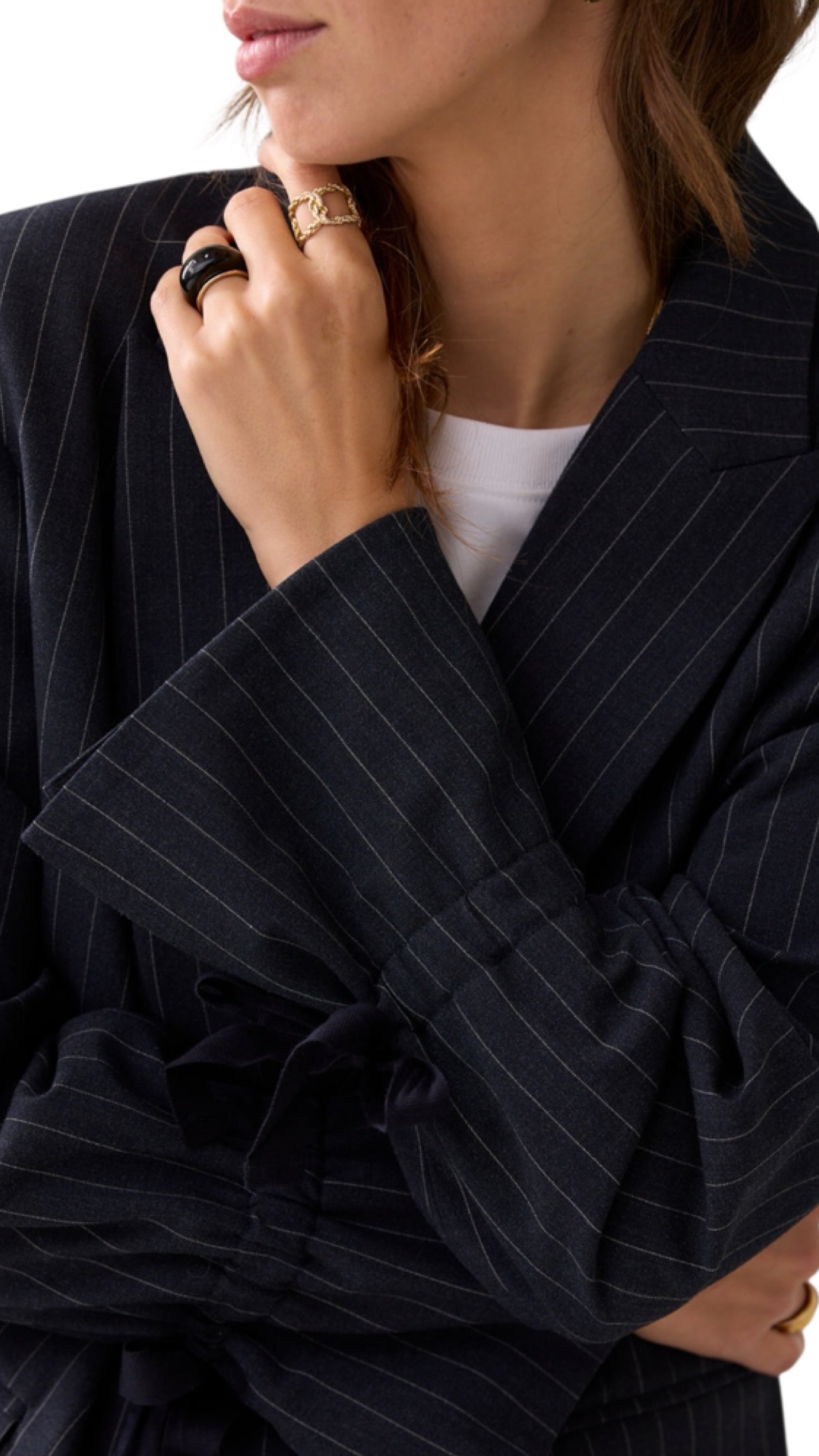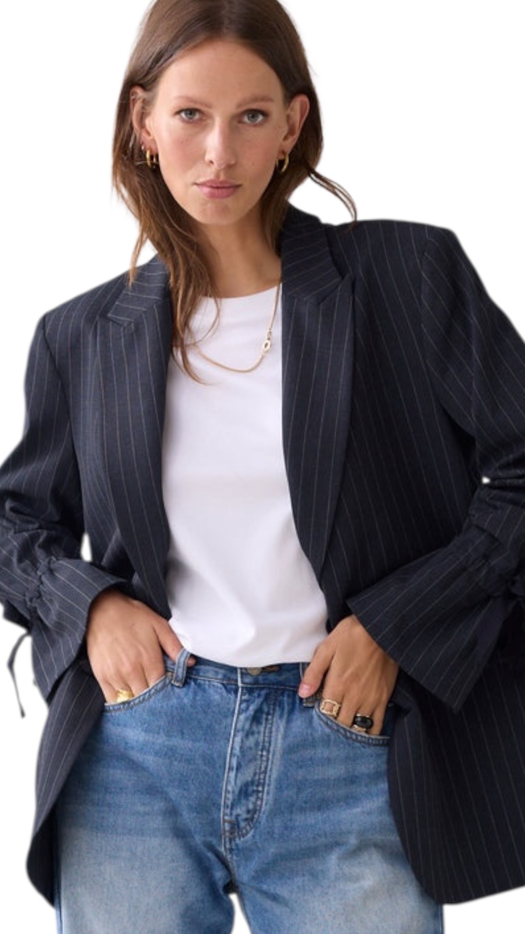 Ruimvallende boyfriend blazer met krijtstreep en klepzakjes aan de voorkant. Het elastiek en koordje in de mouwen maken de blazer veelzijdig te dragen: lang, omgeslagen of opgestroopt.