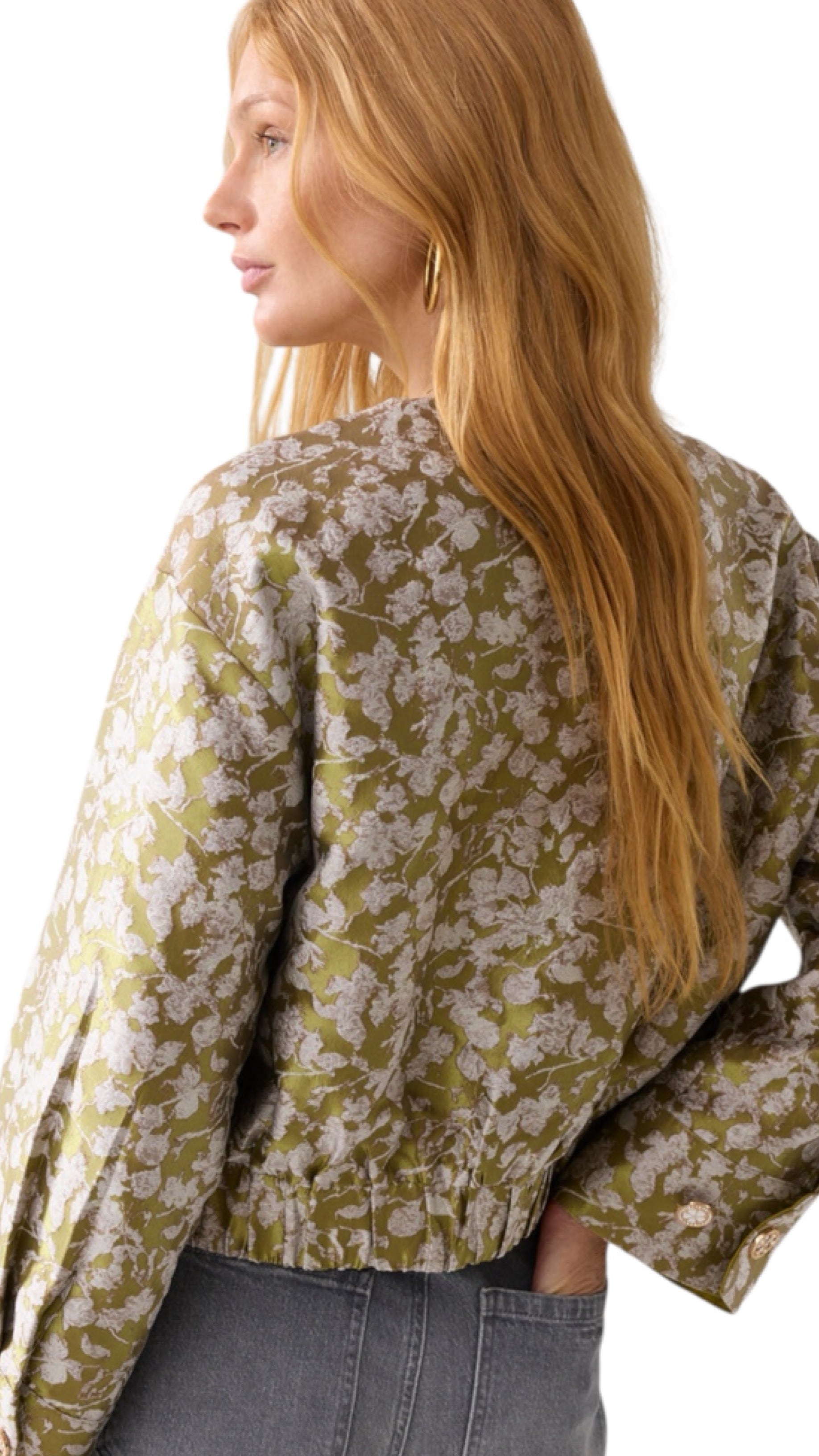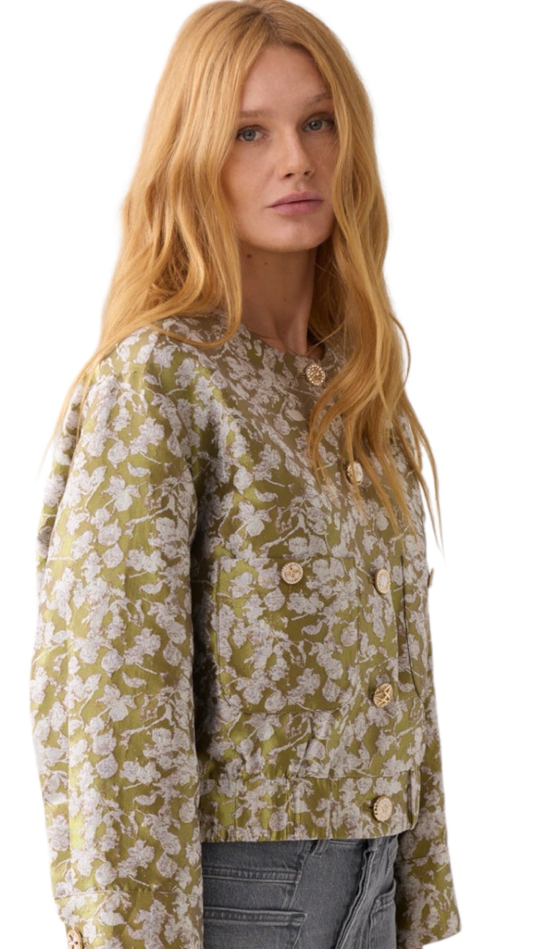 Gevoerd boxy jasje gemaakt van een glanzend jacquard stof met bladerpatroon en afgewerkt met verschillende fancy knopen. De elastische boord aan de onderkant zorgt voor een licht bol silhouet. Het jasje is gevoerd met een glanzende binnenkant.