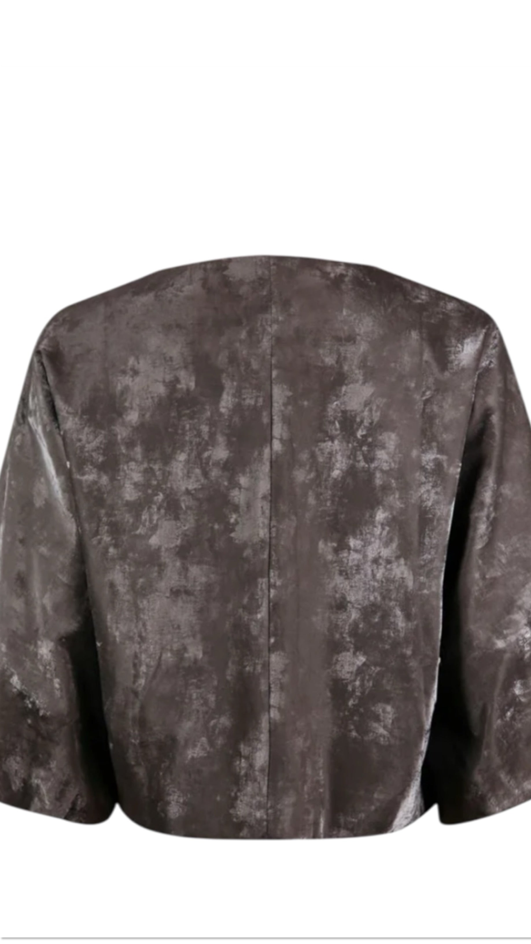 Jacket made of shiny, two-tone grey fabric. Round neckline, 7/8 sleeve length, cropped length, and slightly tailored fit. Closes with a button at the neckline. Perfect match with our coordinating skirt.
