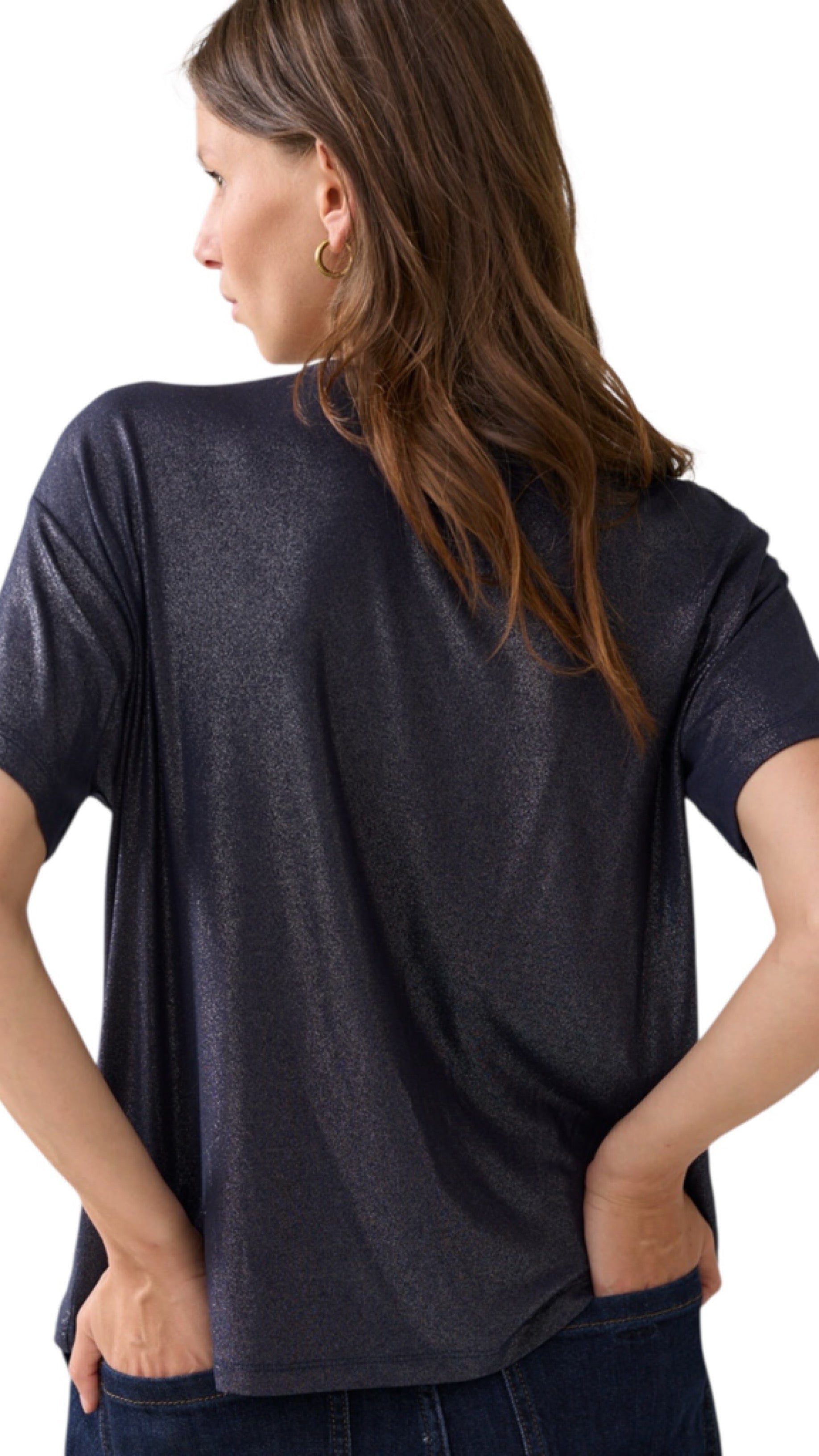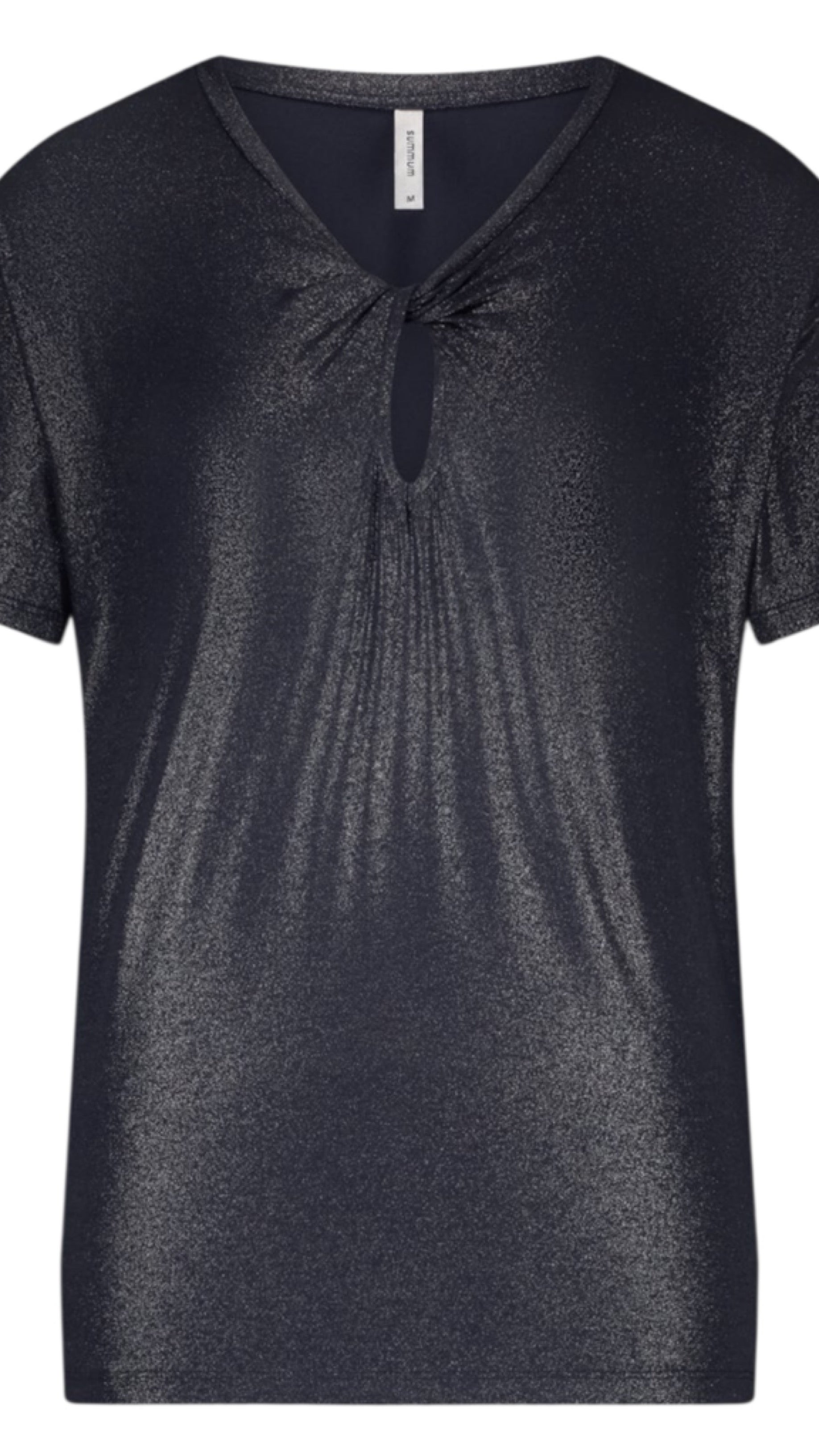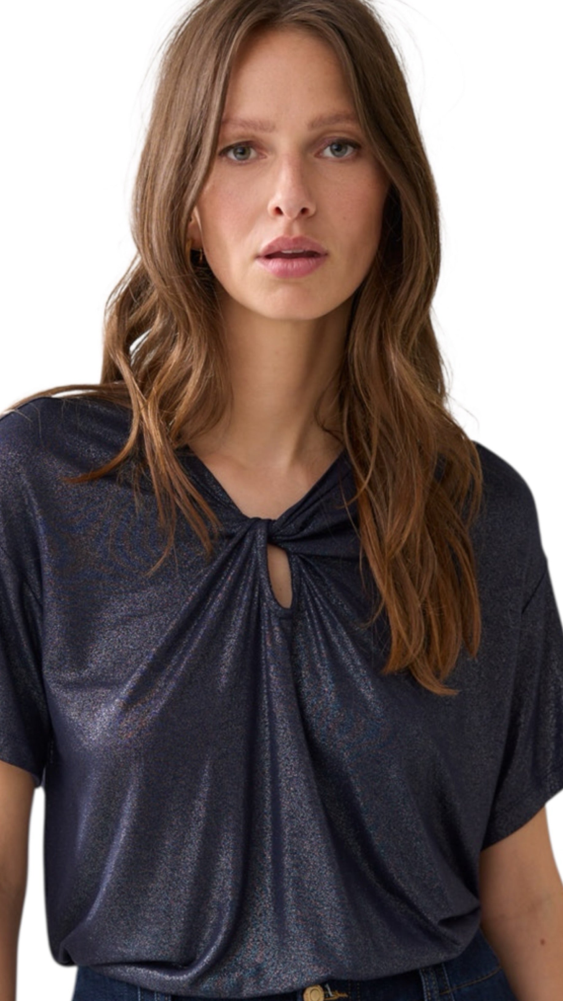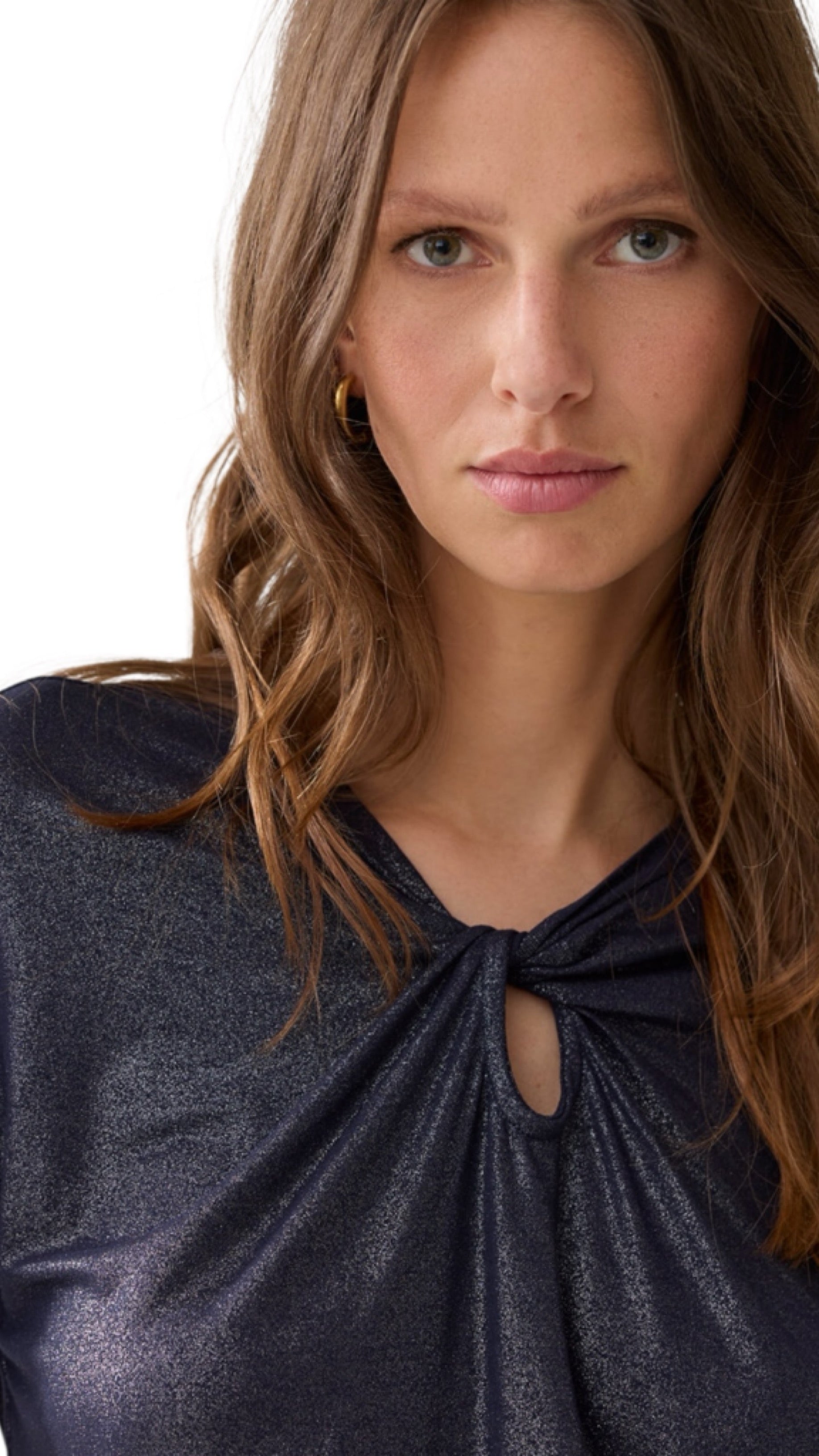 Top met regular fit en gemaakt van een glimmende, bedrukte viscose-jerseykwaliteit. De top heeft een gedraaide halslijn en korte mouwtjes.