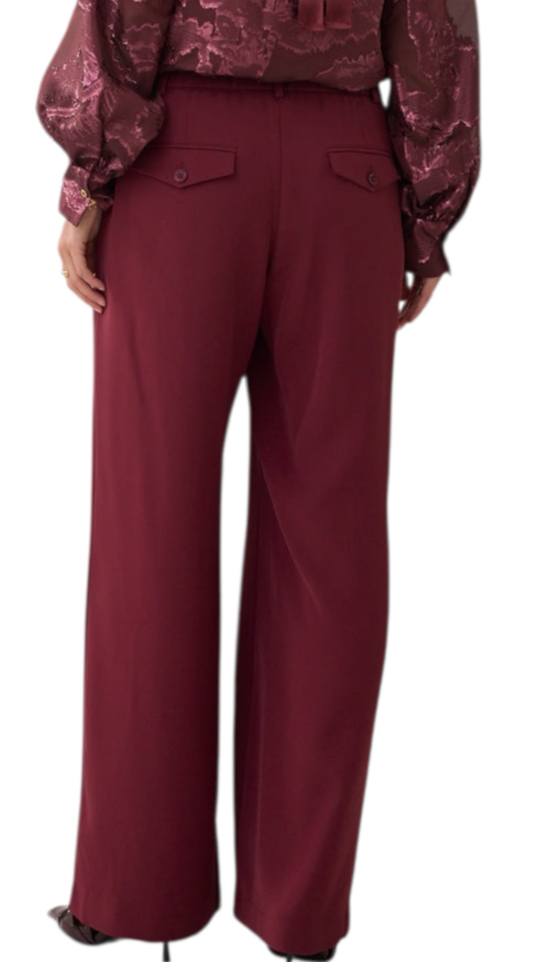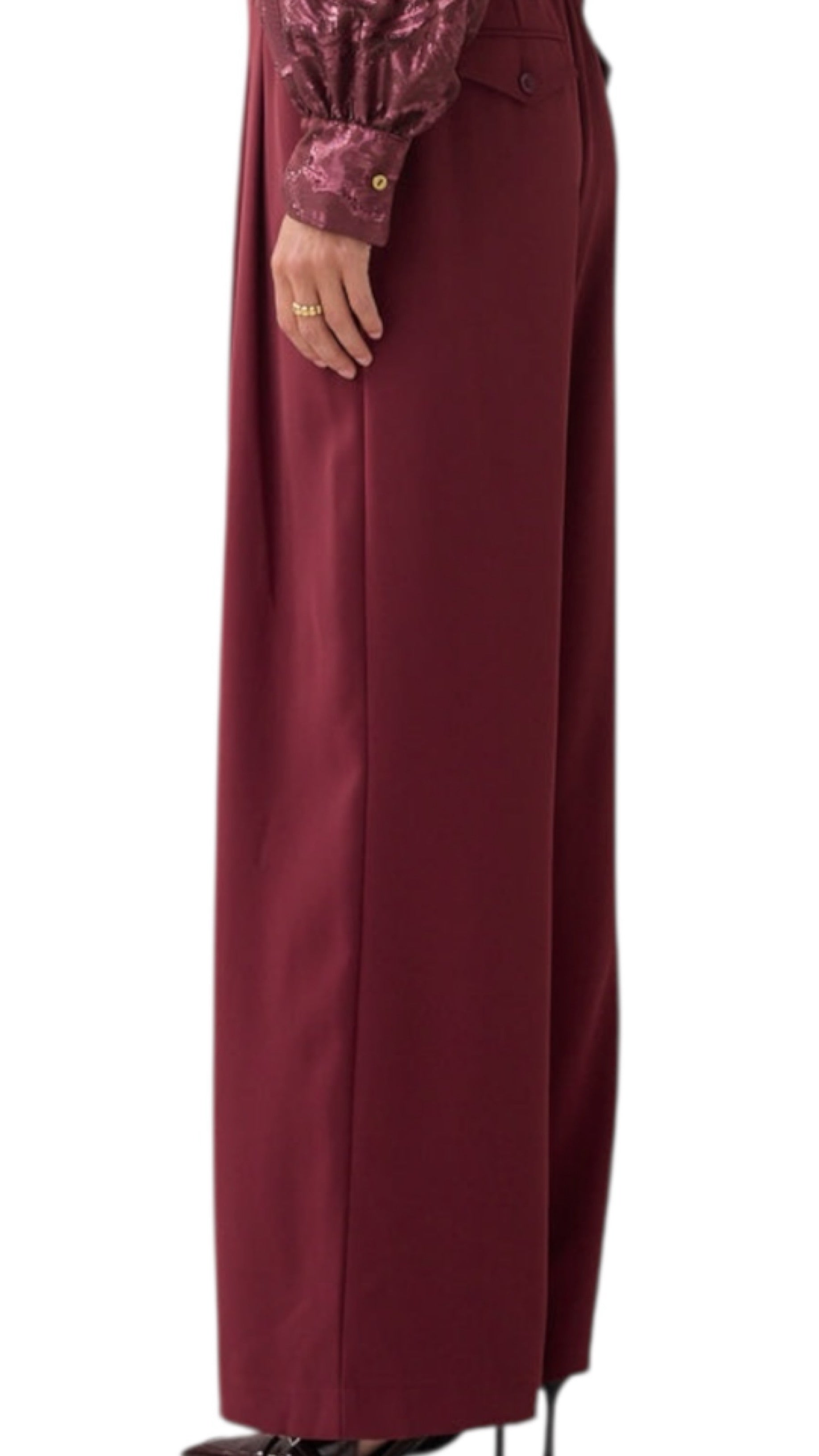 Broek in een soepelvallende fluid kwaliteit met brede stolpplooien en ultra wijde pijpen voor een luchtige uitstraling. De broek heeft een middelhoge taille, steekzakken en valt lang.
